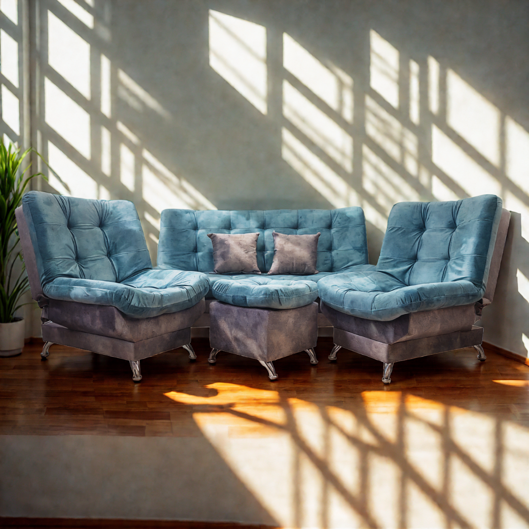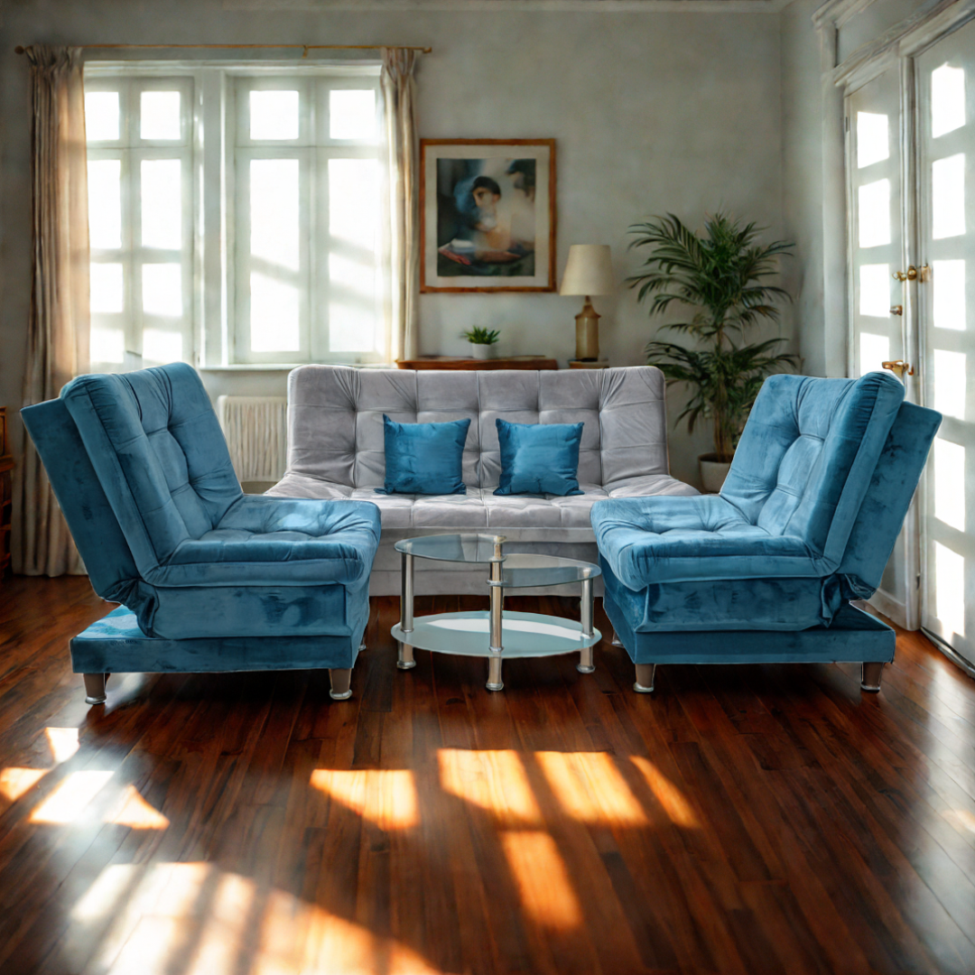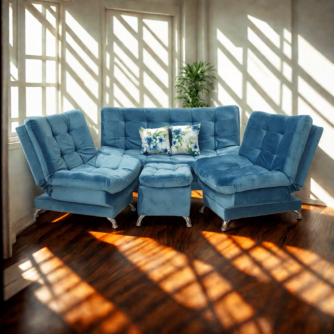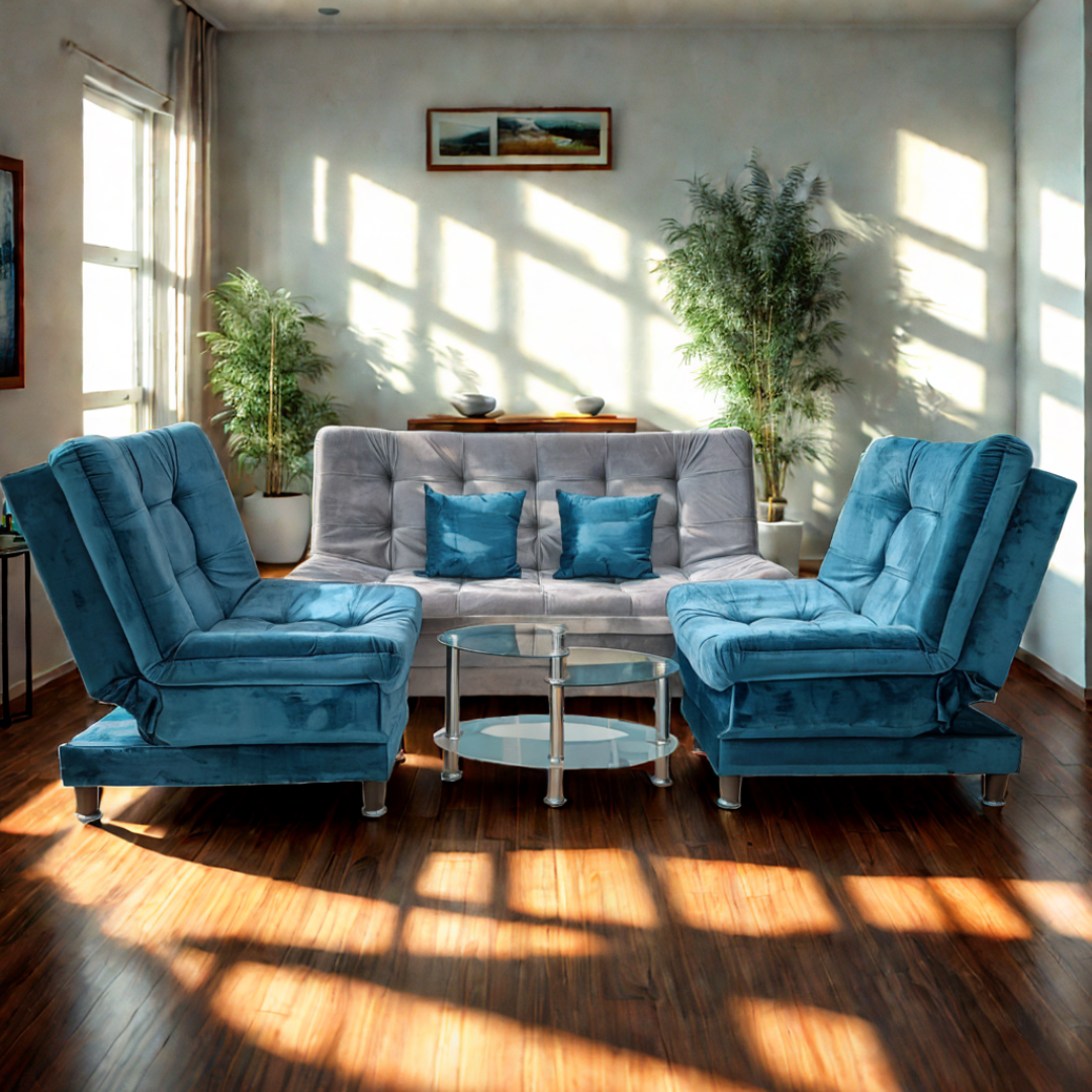 Características: Salas en estructura de pino canadiense con espuma croydon azul.