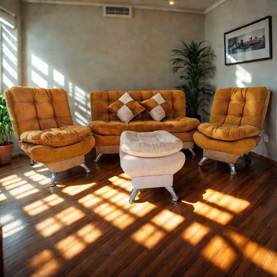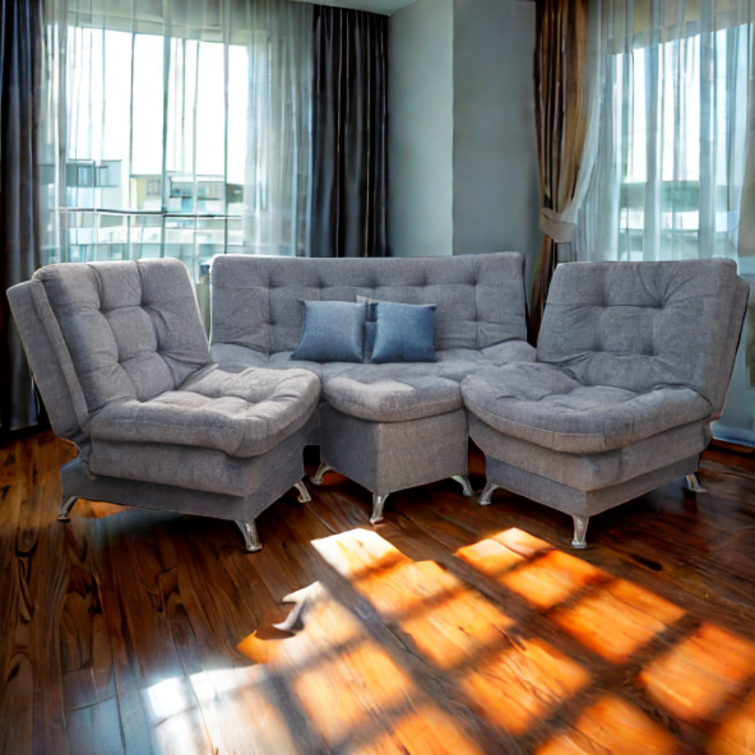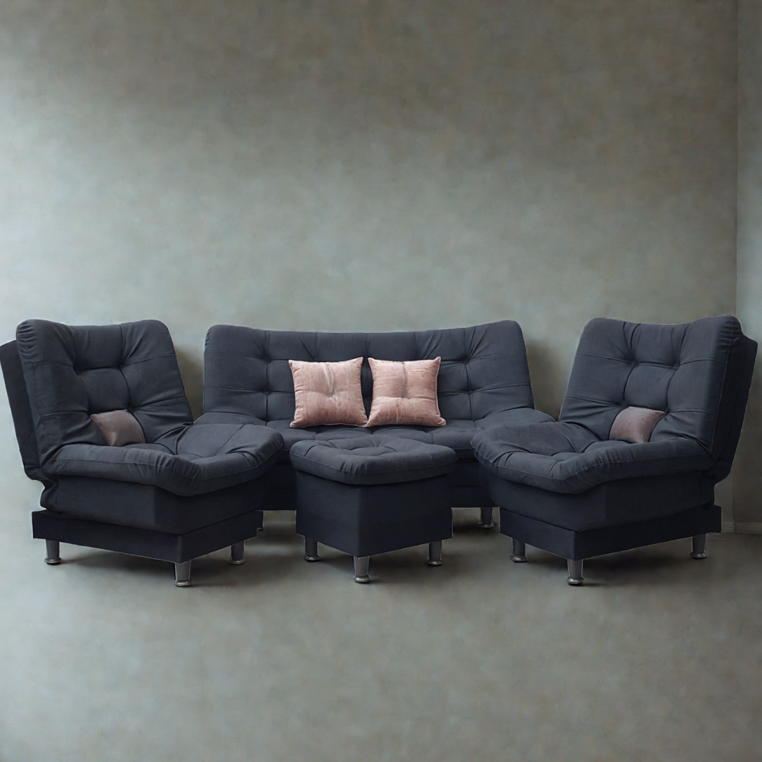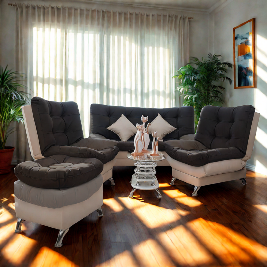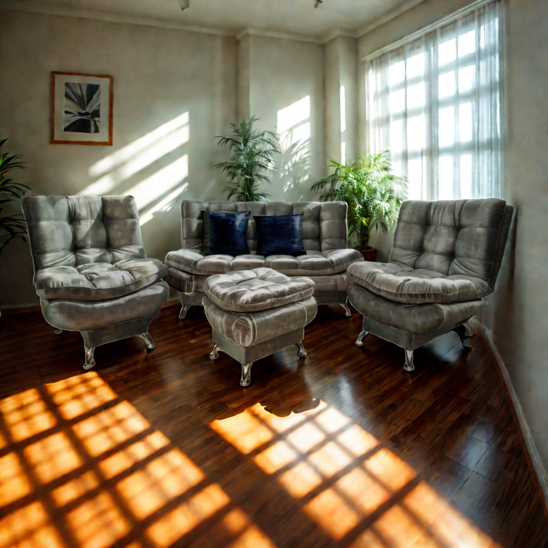 Características: Salas en estructura de pino canadiense con espuma croydon azul.