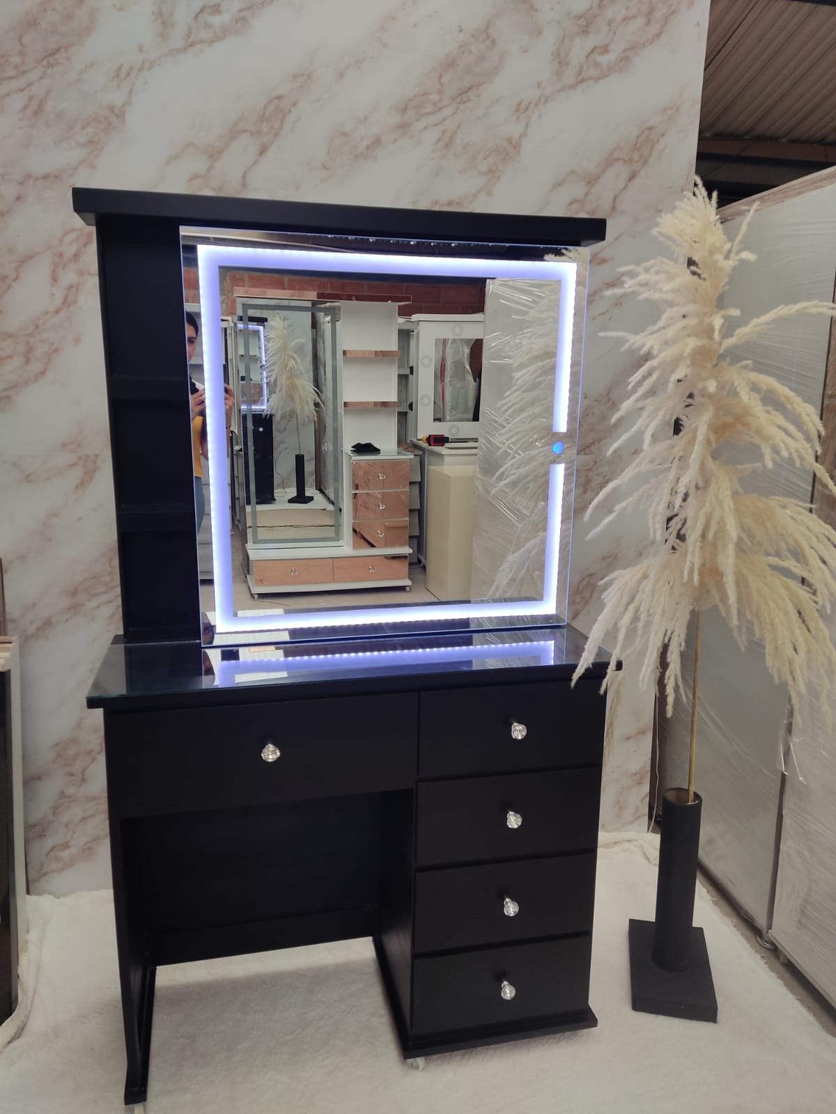 El Tocador Black Mirror LED combina elegancia, funcionalidad y diseño moderno en una sola pieza. Su acabado negro brillante con tiradores tipo cristal aporta un toque sofisticado a cualquier habitación. Cuenta con un espejo corredizo iluminado con luz LED de marco completo, ideal para maquillaje o cuidado personal con visibilidad perfecta. Además, sus cinco cajones y espacio inferior ofrecen amplio almacenamiento para mantener todo en orden.